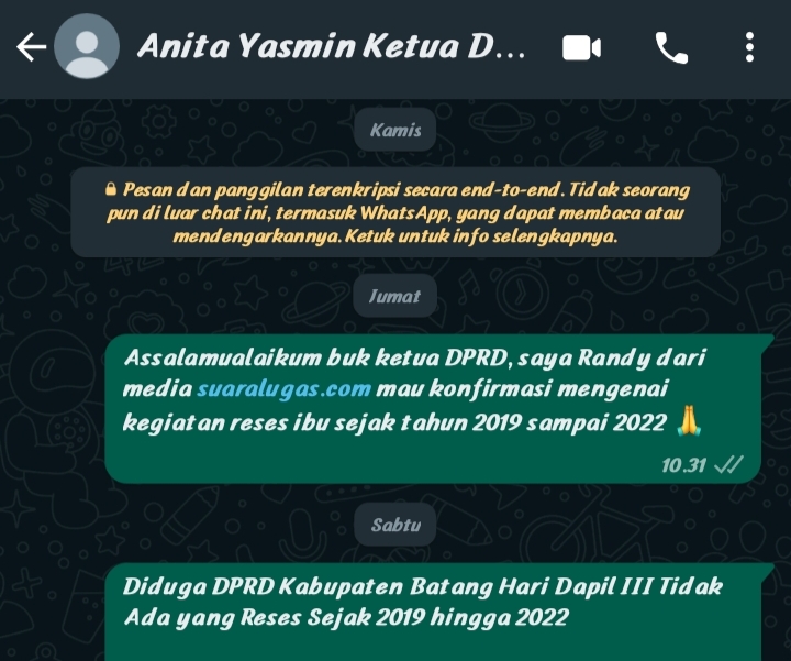Untuk mengetahui lebih dalam kemana saja ia Reses, sayangnya sampai saat ini Anita Yasmin tidak membalas pesan via WhatsApp atau menghubungi media ini untuk memberikan klarifikasi, malah klarifikasi kepada media lain.